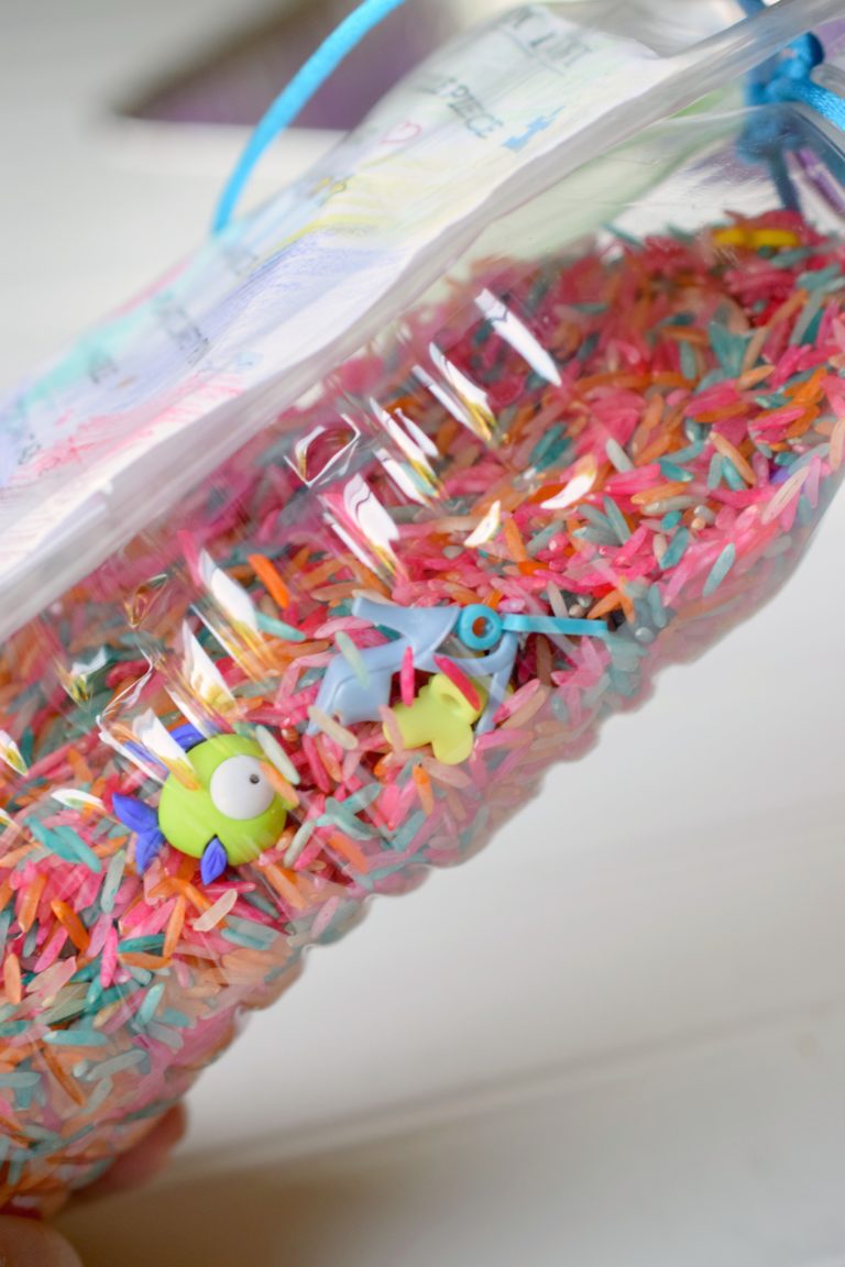 - Funnel colored rice into the bottle, add in trinkets. Shake!
