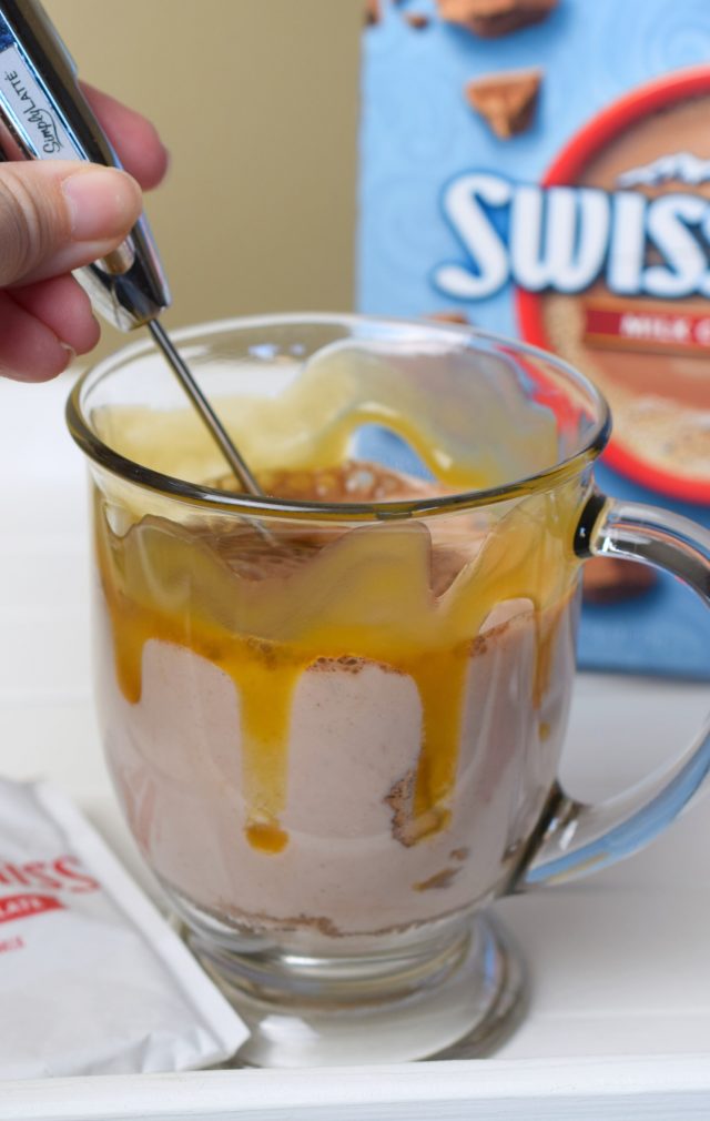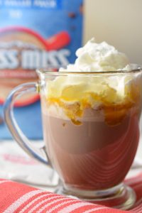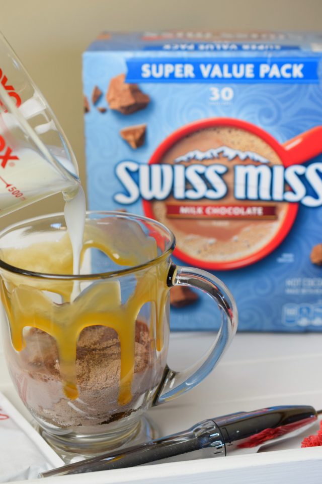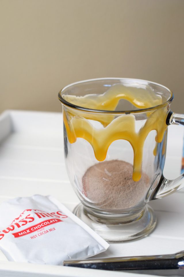 Salted Caramel Hot Cocoa is crazy easy to prepare, let me tell you about it. First, it begins with an envelope of Swiss Miss Milk Chocolate Flavor Hot Cocoa Mix.