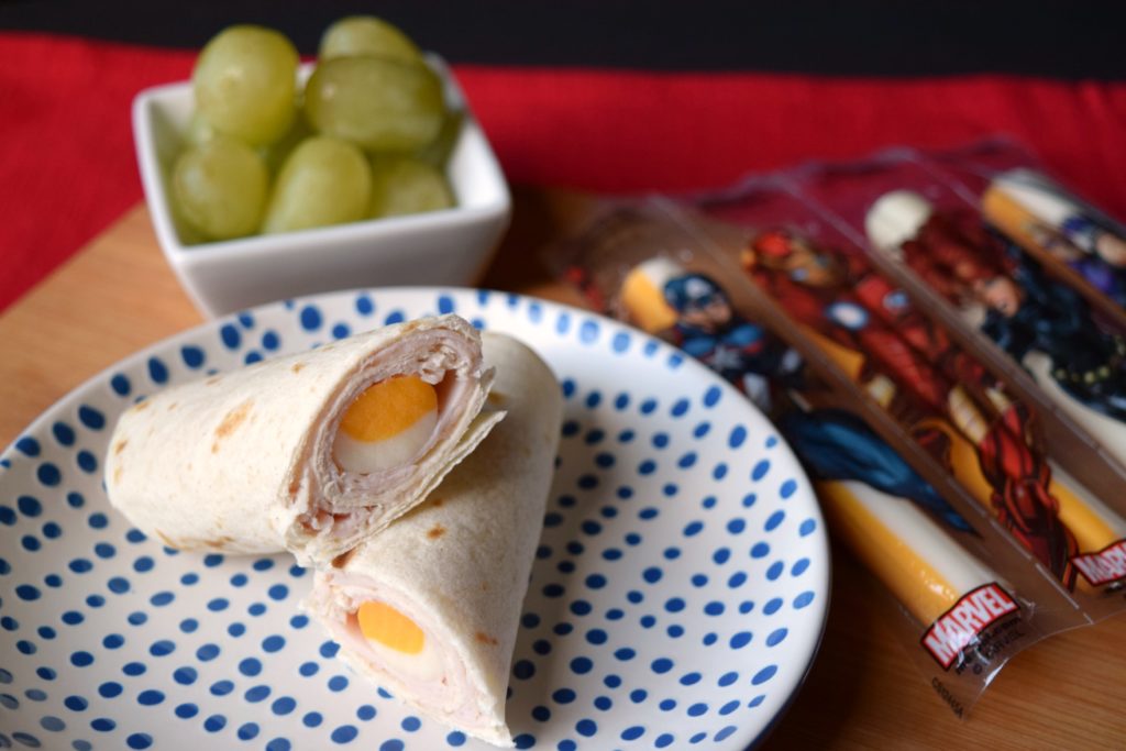 - Lay tortilla flat, top with deli turkey and Marvel® Avengers String Cheese. Roll together, cut if desired.